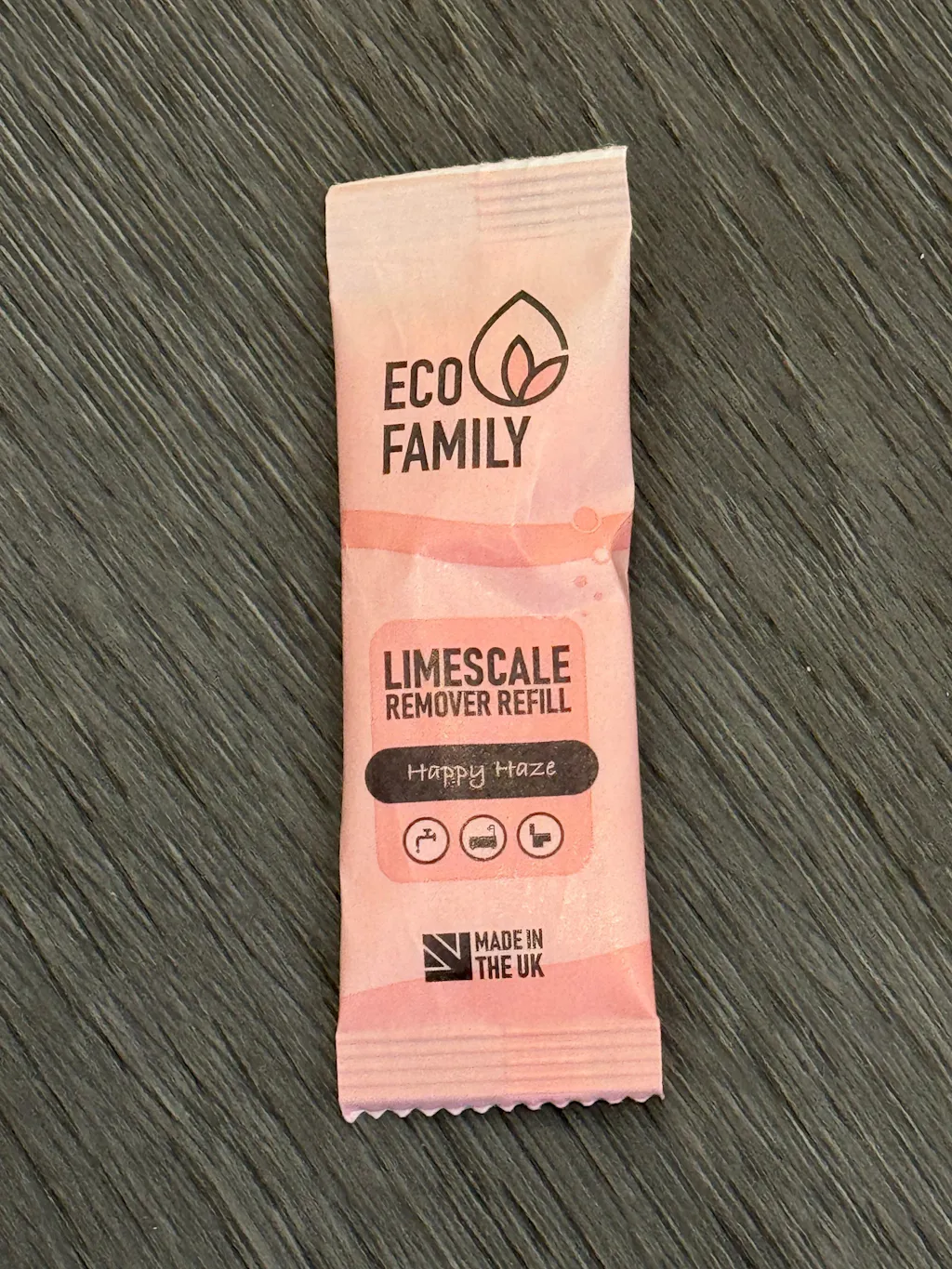 Eco Friendly Limescale Remover Refill, 10g pink sachet. Non-toxic, plastic-free, and effective. Made in the UK by Eco Family.